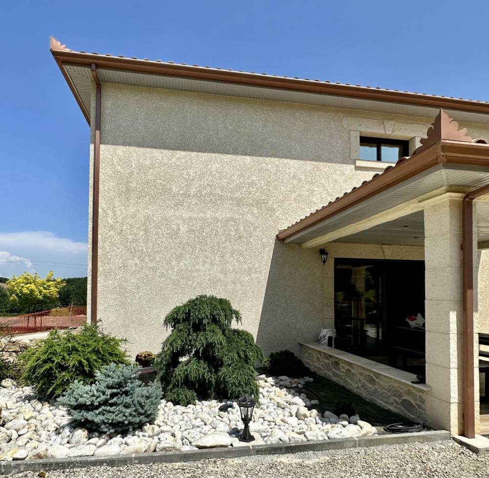 Réalisation d'un enduit de façades sur maison neuve avec rejointoiement de pierres de parements